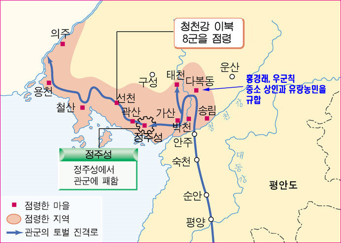 홍경래는 봉기해서 제일 먼저 가산과 곽산의 관아를 점령했다.